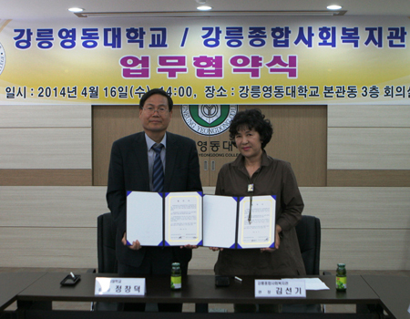 [천지일보=최유라 기자] 강릉영동대학교(총장 정창덕)와 강릉종합사회복지관(관장 김선기)는 상호발전을 위해 지난 16일 오후 2시 강릉영동대학교 대회의실에서 업무 협약식을 체결했다.