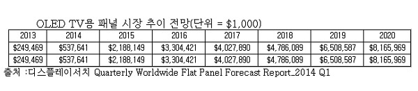 한편 시장조사기관인 디스플레이서치는OLED TV용 패널 시장은 2013년 2억 5000만 달러에서 2015년 22억 달러, 2020년에는 82억 불 규모로 급성장할 것으로 예상했다.