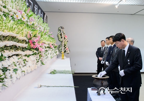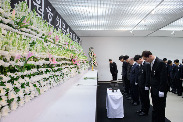 [천지일보=김지현 기자] 세종특별자치 이재관(사진 오른쪽 첫번째) 시장권한대행을 비롯한 세종시 간부공무원들이 28일 오전 9시부터 세종시문화예술회관(조치원읍 소재) 전시실에 설치된 여객선 세월호 침몰 사고 희생자 합동분향소를 찾아 조문했다.