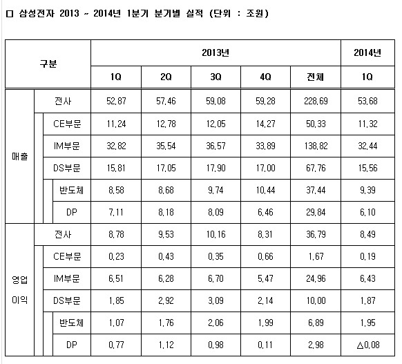[천지일보=이승연 기자] 삼성전자가 계절적 비수에도 불구 무선과 반도체 사업의 도움으로 견조한 실적을 달성했다. 삼성전자는 29일 2014년 1분기에 연결기준 매출 53조 6800억 원, 영업이익 8조 4900억 원의 실적을 기록했다고 밝혔다.