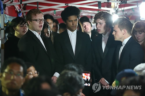 28일 오후 미국 바이올라대학교 합창단은 팽목항 구세군 무료급식 천막에서 열린 예배에 참석해 실종자들의 귀환을 기원하고 희생자들의 넋을 기리는 성가를 불렀다.