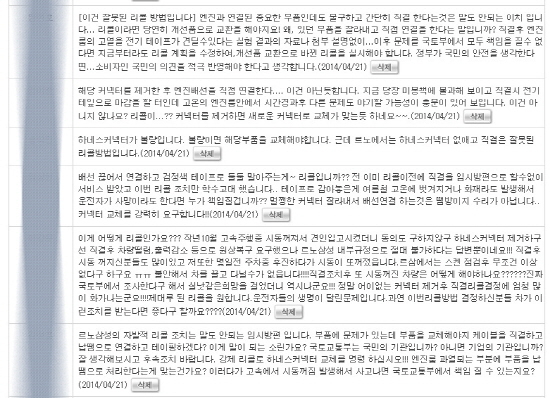 30일 현재 국토부 홈페이지에는 100개가 넘는 불만 댓글이 달렸다. 르노삼성차 SM5 승용차 소유자가 최근 국토부가 공지한 르노삼성차의 자체 리콜에 대해 “임시방편 조치”라며 불만을 토로하고 있다.