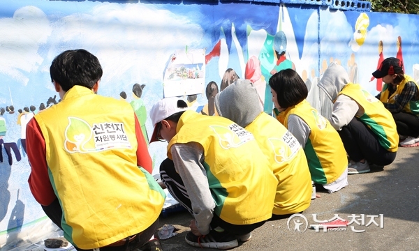 [천지일보=박준성 기자] 신천지 인천교회 자원봉사단이 29일 인천 남구 주안동 한 주택가 담벼락에 벽화그리기 봉사활동을 하고 있다. 봉사자들은 어둡고 소외된 계층과 낙후된 동네에 삶의 의욕과 소망을 심어주기 위한 뜻이 담긴 4가지 계절을 벽화로 표현했다.