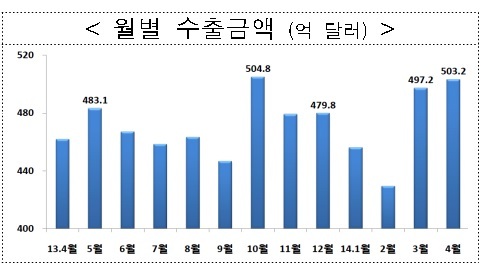 산업통상자원부가 1일 발표한 ‘4월 수출입동향’에 따르면 지난 4월 수출규모는 지난해 동기보다 9.0% 증가한 503억 1500만 달러를 기록했다. 2013년 10월 504억 8000만 달러 기록에 이은 두 번째 높은 실적이다.