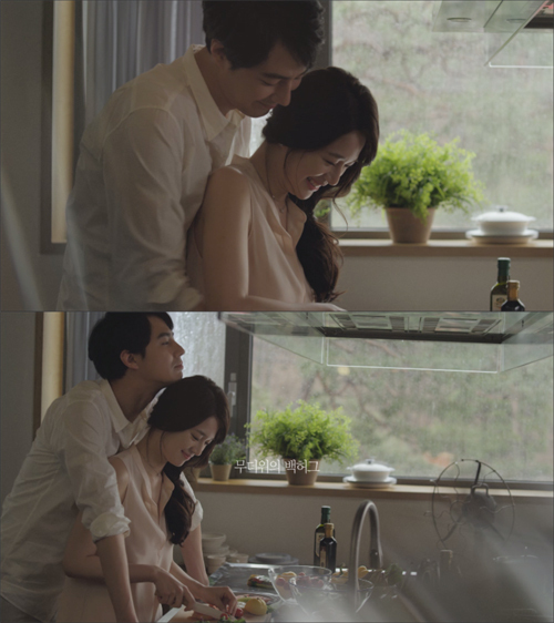 ‘장마 열흘째, 불쾌지수 82’라는 문구와 함께 주방에서 흰색 셔츠 차림의 조인성이 베이지 색 민 소매 블라우스를 착용하고 청순한 모습으로 요리를 하고 있는 이엘리야를 조심스럽게 백허그 하는 모습이 매우 사랑스럽다.