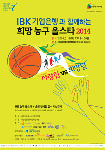 [천지일보=김현진 기자] (사)한기범희망나눔은 오는 17일 오후 2시 30분부터 잠실학생체육관에서 ‘IBK기업은행과 함께하는 희망농구올스타 2014’ 자선경기를 개최한다.