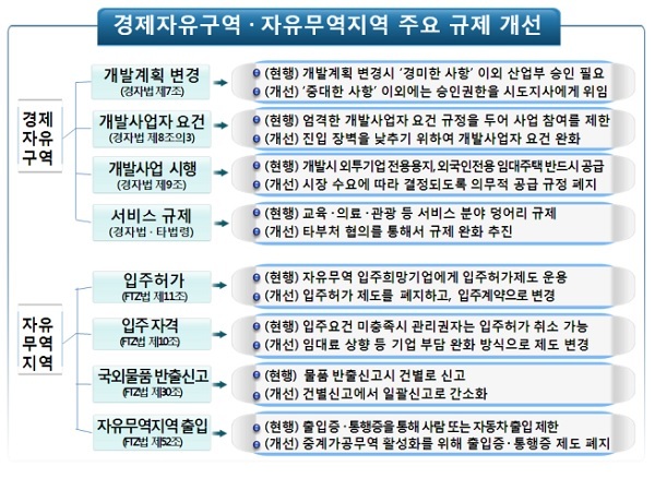 더불어 경제자유구역을 고부가가치 서비스 허브로 조상하기 위해 교육‧의료‧관광 분야의 ‘덩어리 규제’를 관련 부처와 적극 협의해 개선하기로 했다.