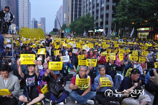 [천지일보=장수경 기자] 24일 오후 서울 중구 청계광장에서 열린 ‘세월호 참사 2차 범국민촛불 행동’ 집회에서 참가자들이 ‘박근혜 퇴진’이란 손 피켓을 들고 구호를 외치고 있다.