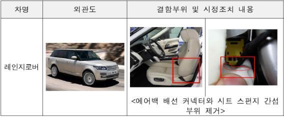 재규어·랜드로버의 레인지로버 129대는 에어백이 작동되지 않을 가능성이 발견됐다. 운전석과 조수석 시트 내에 설치된 에어백 배선 커넥터가 시트 스펀지의 간섭으로 연결된 배선이 단선될 수 있어 이로 인해 에어백이 작동되지 않을 수 있다는 것이다.