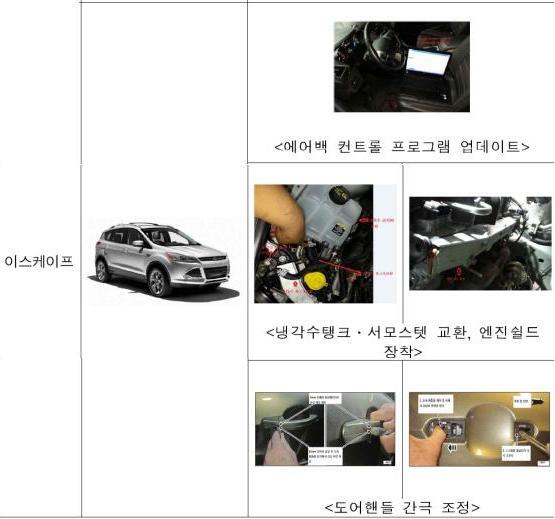 포드 이스케이프 모델 2216대에서는 에어백과 냉각계통, 도어핸들 결함 등의 결함이 발견됐다. 소프트웨어 문제로 사이드에어백의 전개가 늦어질 수 있고, 냉각효율저하에 따른 실린더헤드 균열과 오일누유로 화재위험성이 있다는 것이다. 도어핸들은 간극 부족으로 문이 정확히 닫히지 않아 주행 중 열릴 가능성이 제기됐다.