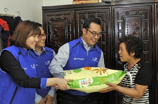 효성은 가정의 달을 맞아 지난 26일 본사가 위치한 마포구에 경제적으로 어려움을 겪고 있는 이웃에게 쌀을 나눠주는 행사를 가졌다고 27일 밝혔다. 이 나눔 행사는 2006년부터 진행돼오고 있다.