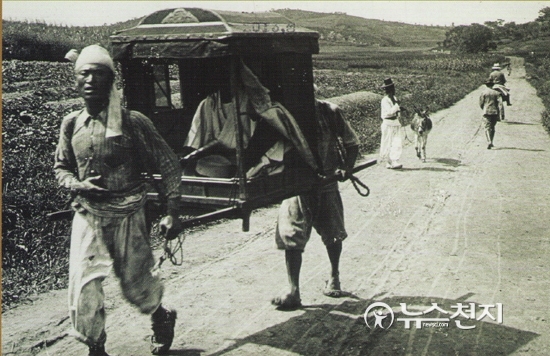 [천지일보=김현진 기자] 농촌 지주가 가마를 타고 도성 안으로 들어오고 있는 모습이다. 뒤편 보이는 외국 사람은 프랑스 여행가 코펫트이다. 그가 한국에 와서 많은 문화를 촬영해 남긴 것을 그 후손으로부터 정성길 계명대 동산의료원 명예박물관장이 입수한 사진 중 하나다.