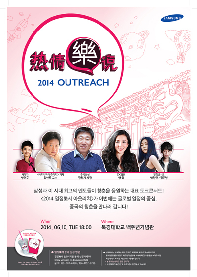 삼성그룹은 오는 6월 10일 오후 6시 북경대학교 백주년기념관에서 한국인 유학생과 중국 대학생을 대상으로 ‘열정樂서’ 중국편을 개최한다고 29일 밝혔다.