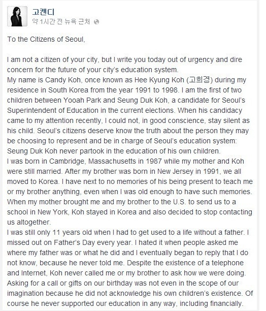 자신을 고 후보의 큰딸이라고 밝힌 고희경(Candy Koh) 씨는 31일 페이스북에 ‘서울 시민에게’라는 제목의 글을 올렸다.