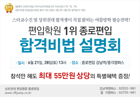 [천지일보=최유라 기자] 종로편입학원(www.JRjump.co.kr)이 여름방학 시즌에 ‘2015년 편입 합격비법 설명회’를 개최한다.
