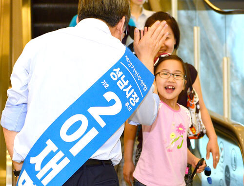 [천지일보=정인선 기자] 새정치민주연합 이재명 성남시장 후보는 지난 1일 서현역 AK플라자를 찾아 시민과 만났다. 이날 이 후보를 본 아이들이 먼저 다가와 손바닥을 치고 ‘화이팅’을 외치며 응원했다.