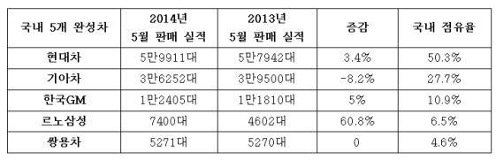[천지일보=손성환 기자] 국내 5개 완성차 업체가 5월 판매실적을 일제히 발표했다. 현대자동차와 르노삼성자동차, 한국GM 등은 국내외 판매가 늘었지만, 기아자동차는 국내 판매가 줄었다.