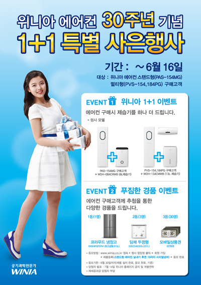 [천지일보=이승연 기자] 위니아만도가 위니아 에어컨 30주년을 맞아 이달 16일까지 ‘위니아 1+1 이벤트’를 진행한다.