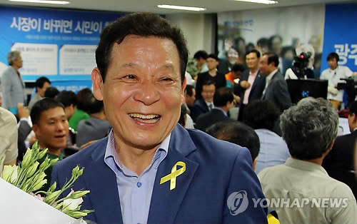 5일 오전 1시 개표율 45.1% 가운데 윤장현 후보가 57.6%를 득표해 32.7%를 얻은 무소속 강운태 후보를 크게 앞서며 광주시장에 당선됐다.