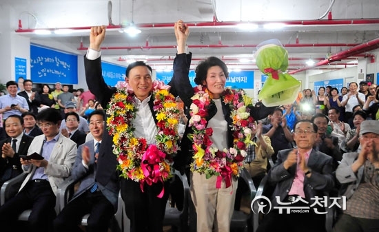 [천지일보 천안=박주환 기자] 구본영 천안시장 당선자(61, 새정치민주연합)가 5일 새벽 53.1%의 득표율로 최민기 새누리당 후보(39.7%)를 누르고 당선을 확정지었다.