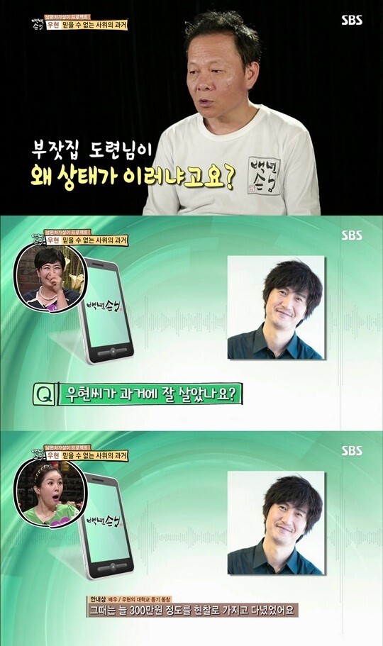 이후 제작진은 우현의 친구인 안내상에게 전화를 걸어 “우현 씨가 과거에 잘 살았나”라고 물었다. 안내상은 “잘 살았다. 그 때 늘 300만 원 정도를 현찰로 가지고 다녔다”며 “써도 써도 그 돈을 다 못 썼다”고 말해 제작진을 깜짝 놀라게 했다.