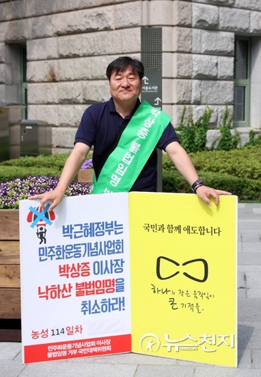 [천지일보=김민아 기자] 민주화운동기념사업회 이사장 불법임명거부 국민대책위원회가 10일 서울시 중구 서울시청 앞에서 “박상증 이사장 낙하산 불법 임명을 취소하라”며 1인 시위를 벌이고 있다.