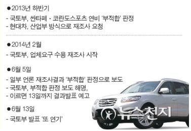 [천지일보=손성환 기자] 연비 부풀리기 논란 속에 있는 현대차 싼타페와 쌍용차 코란도스포츠의 연비에 대한 정부의 재조사 결과발표가 또 연기됐다. 국토교통부는 이르면 13일까지 재조사 결과를 발표할 예정이었으나 산업통상자원부와의 의견차로 난항을 겪고 있는 것으로 업계는 분석했다.