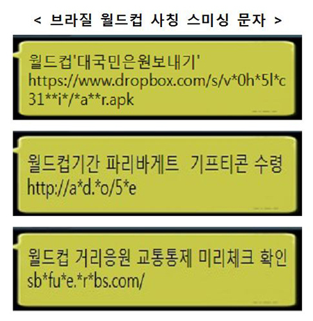 추가로 확인된 스미싱 문자는 ‘월드컵 대국민은원보내기’, ‘월드컵기간 파리바게트 기프티콘 수령’, ‘월드컵 거리응원 교통통제 미리체크 확인’ 등이며 인터넷주소(URL)를 포함하고 있다.