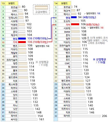 특히 현대차는 프리미엄 브랜드를 포함한 전체 32개 브랜드 순위에서도 전년 대비 6계단 상승한 4위에 오르며 BMW(8위), 벤츠(13위) 등 쟁쟁한 고급 브랜드들을 제쳤으며, 기아차도 전년 대비 4계단 상승한 6위를 차지해 한 자릿수 순위에 최초로 진입했다.