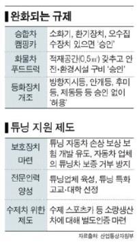 이에 정부는 지난해 8월 ‘자동차 튜닝시장 활성화 방안’을 발표하고 올해 3월 ‘규제개혁 장관회의’ 이후 범정부 차원의 튜닝산업 진흥대책을 마련했다. 튜닝규제 완화와 제도적 기반 구축 등을 통해 튜닝시장의 규모를 키우고, 중소부품·정비업체 중심의 새로운 일자리 창출을 꾀할 계획이다. 이를 통해 튜닝시장 규모와 관련 일자리를 5000억 원, 1만 명(2012년)에서 오는 2017년에는 2조 7000억 원, 2만 명으로 확대할 방침이다.