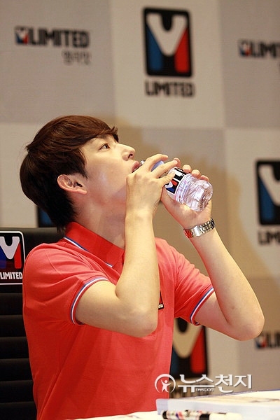 ▲ 그룹 제국의아이들(ZE:A) 멤버 임시완이 21일 오후 경기 수원시 팔달구 매산로 AK플라자 수원점에서 열린 메트로 아웃도어 브랜드 ‘엠리밋’ 브랜드 팬사인회를 성황리에 진행했다. 사인회 전 임시완이 타는 갈증에 물을 마시고 있다. ⓒ천지일보(뉴스천지)