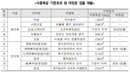 특히, 유명 백화점 및 대형마트에서 판매 중인 즉석 제조선식 8개 중 4개 제품(롯데마트, 롯데백화점, 신세계백화점, AK백화점)이 식중독균 또는 대장균에 오염된 것으로 확인되어 안전성이 취약한 것으로 나타났다.