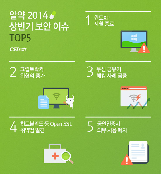 [천지일보=최유라 기자] 이스트소프트(대표 김장중)는 올해 상반기에 발생한 의미 있는 보안 동향을 돌아보고, 사용자 보안 의식 고취를 위해 ‘2014 상반기 보안 이슈 TOP5’를 발표했다.
