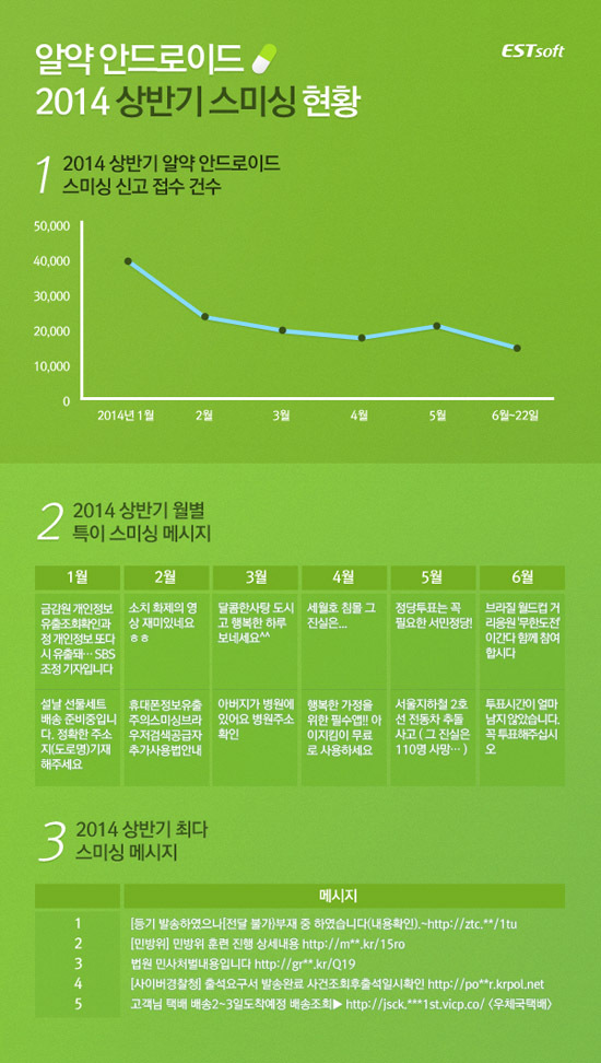 아울러 이스트소프트는 ‘알약 안드로이드 2014 상반기 스미싱 현황’을 정리했다. 2014년 상반기 동안 알약 안드로이드로 접수된 스미싱 신고 건은 약 15만 건으로, 스미싱 공격이 계속해서 사용자 보안을 위협하고 있는 것으로 보인다. ‘2014 상반기 월별 특이 스미싱 메시지’를 보면, 특히 사회적 이슈가 발생할 때마다 관련 스미싱이 기승을 부리고 있는 것을 확인할 수 있다. 계속해서 꾸준히 유포되고 있는 최다 스미싱 메시지는 등기, 민방위, 택배 등의 키워드를 활용한 것으로 해당 메시지에 대한 사용자의 각별한 주의가 필요하다.
