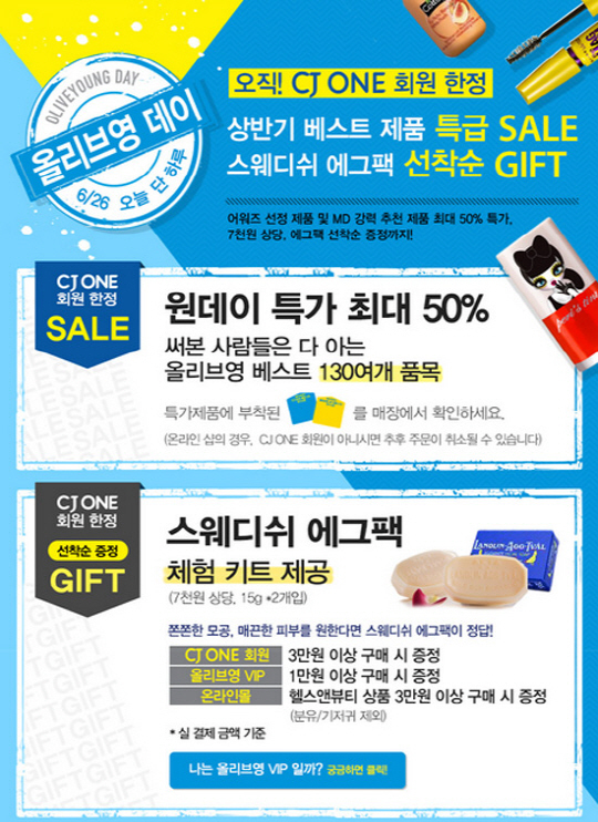 올리브영은 26일 단 하루만 CJ ONE 회원을 대상으로 ‘올리브영데이’를 운영.