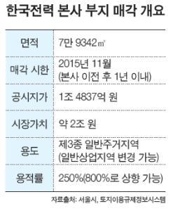 한전 삼성동 부지는 축구장 11배 크기인 7만 9342㎡(2만 4000평) 규모로 서초구 삼성타운의 3배, 대형빌딩 4개가 들어선 여의도 IFC몰의 2배 이상이다. 공시지가는 1조 4837억 원에 시장가치는 현재 2조 원을 넘어섰다. 인근에 코엑스와 대형 컨벤션센터, 무역센터 등과 함께 특급 호텔들이 늘어선 것도 장점이다. 용도는 제3종 일반주거지역이며 도심지역으로 층수 제한이 없어 100층이 넘는 고층 건물도 지을 수 있다.