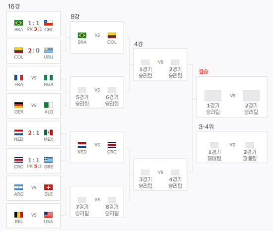 8강에 진출한 브라질은 오는 5일 콜롬비아와 4강 진출을 놓고 다투게 된다. 네덜란드 코스타리카는 다음 날인 6일 격돌할 예정이다.