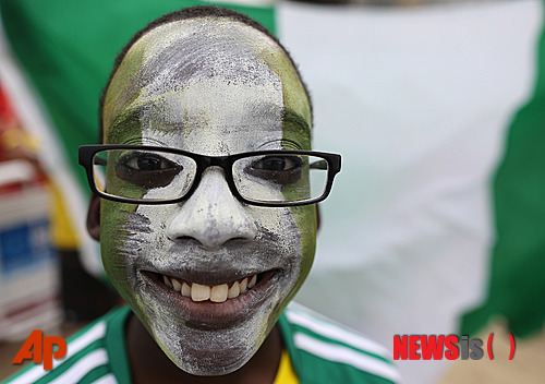 【브라질리아=AP/뉴시스】나이지리아 국기를 얼굴에 그린 축구팬이 1일(한국시간) 브라질리아의 이스타지우 나시오날에서 열린 프랑스와의 2014브라질월드컵 16강전을 기다리고 있다.