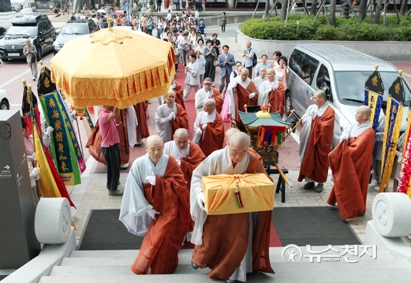 [천지일보=박준성 기자] 불교중앙박물관은 불교미술의 태동이 되는 ‘열반과 사리신앙’을 주제로 ‘열반, 궁극의 행복’ 특별전을 1일부터 8월 24일까지 개최한다. 불교박물관은 개막식에 앞서 1일 오전 조계사 대웅전에서 ‘현등사 사리 이운식(사리를 옮기는 예식)’을 거행하고 있다.