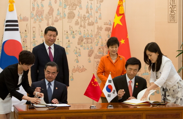 [천지일보=명승일 기자] 박근혜 대통령과 시진핑 중국 국가주석이 3일 청와대에서 윤병세 외교부 장관과 왕이 중국 외교부장의 한중 협정서명식에 배석하고 있다. (사진제공: 청와대)