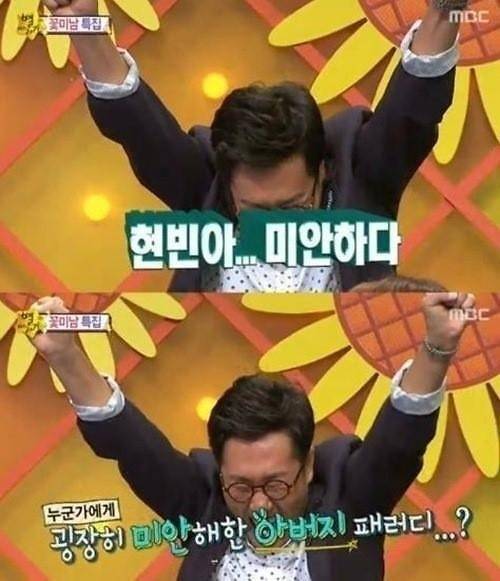 이에 김영철은 고개를 푹 숙이고 손을 번쩍 든 채 “현빈아, 미안하다”라고 말했다. 이때 ‘누군가에게 미안해 한 아버지 패러디’라는 자막이 삽입돼 웃음을 자아냈다.