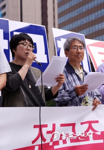 [천지일보=김민아 기자] 강혜승 참교육을위한학부모회 서울지부장이 10일 서울시 종로구 광화문 광장에서 개최된 ‘전교조 설립취소 규탄 및 박근혜 퇴진 시민 학부모 선언 기자회견’에서 선언문을 발표하고 있다.