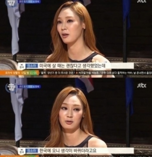 이에 MC 유세윤이 “외국에서 생활했는데 의외다”라고 말하자, 정소라는 “미국에서 살았을 때는 괜찮다고 생각했는데, 한국에서 4~5년 지내다보니 생각이 바뀌더라”고 전했다.