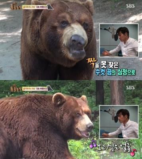 또한 그는 수컷 곰들을 향해 ‘용의자’라고 표현하며 수컷 곰의 목소리를 흉내 냈다. 김상중 씨는 “해당 곰들은 진술을 거부하고 모르쇠로 일관하고 있다” 등의 멘트로 웃음을 자아내기도 했다.