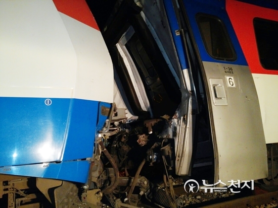 [천지일보 태백=이현복 기자] 강원 태백시 태백역∼문곡역 사이 철길에서 22일 오후 영동선 여객 열차끼리 충돌해 탈선해 있다.