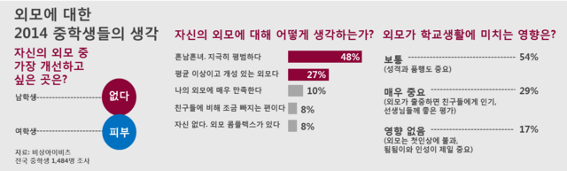 ‘매우 중요’라고 답한 학생들은 “외모가 출중하면 친구들에게 인기를 얻고, 선생님들에게 좋은 평가를 받기 때문”이라고 판단했다. ‘보통’을 선택한 학생들은 “성격과 품행도 중요하지만 외모가 어느 정도 영향을 미친다”고 답했다.
