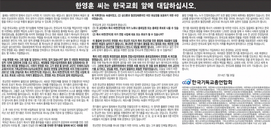 [천지일보=강수경 기자] 한국기독교총연합회(한기총, 대표회장 홍재철 목사)가 최근 일간지에 성명을 내고 한국교회연합(한교연) 대표회장 한영훈 목사의 치부를 드러냈다. 한기총은 성명에서 한교연 가입을 희망하고 있는 교단장들을 회유하는 메시지를 포함했다.