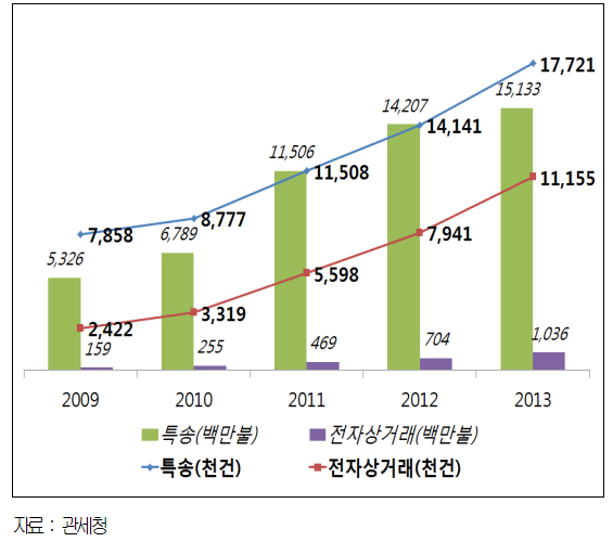 대한상의는 “소액이긴 하지만 인터넷 쇼핑물량은 해년마다 200만~300만 건씩 증가하면서 해외특송시장의 성장을 견인하고 있다”며 “국내외적으로 해외 인터넷 쇼핑몰에 대한 거래가 폭증하는 만큼 해외특송 시장의 성장세는 당분간 지속될 것”이라고 말했다.