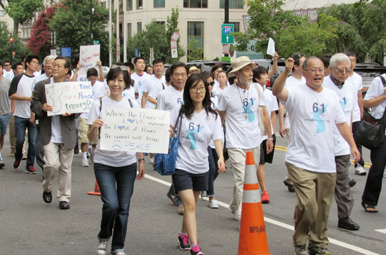 지난달 28일 한국기독교교회협의회(총무 김영주 목사)는 26일(현지시각) 미국 워싱턴 한복판에서 현지 기독교계와 NCCK가 참여한 가운데 한반도 평화조약을 촉구하는 외침이 울려 퍼졌다고 밝혔다. 이들은 평화통일 문제를 푸는 데 남북한뿐만 아니라 미국사회의 관심과 역할이 중요하다고 강조하며 이날 평화행진을 진행했다.
