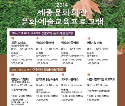 [천지일보=손예은 기자] 세종문화회관(사장 박인배)이 오는 9월, 2학기 문화예술 교육 프로그램을 개강한다.